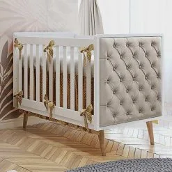 Quarto De Bebê Retrô Cômoda Cleo Com Fraldário Berço Lorena C/ Capitonê Branco Carolina Baby