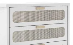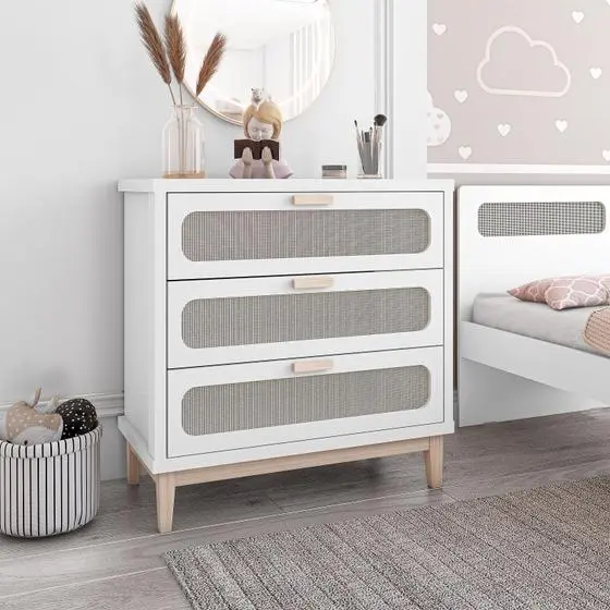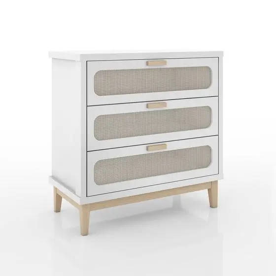 Você merece uma comoda que seja tão funcional quanto estilosa, e é exatamente isso que a comoda de 3 gavetas com corrediça telescópica, pés de madeira e puxador também de madeira oferece. Além disso, essa peça incrível conta com um detalhe especial nas gavetas: a palha indiana sintética.