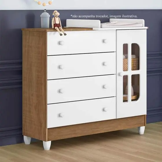 Cômoda Infantil 4 Gavetas com Fraldário Gabrielle Branco Amadeirado Carolina Baby
