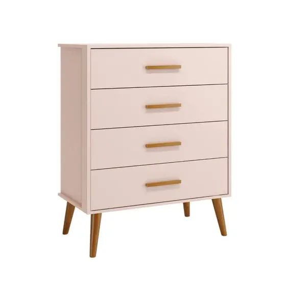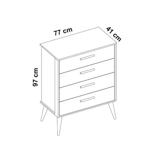 A cômoda Isis é uma excelente opção pra quem procura por qualidade, beleza e praticidade. Seus pés retro em madeira dão charme e elegância ao produto. Possui 4 gavetas espaçosas, corrediças telescópicas e puxadores em madeira.