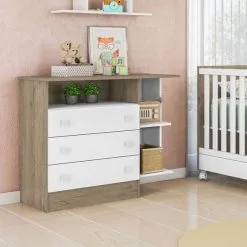 Jogo de Quarto de Bebê 03 Peças Doce Sonho – QmoviA linha infantil da Qmovi era o que faltava para o seu bebê. Uma linha com vários produtos modernos e um padrão de qualidade para as mamães exigentes e preocupadas com a segurança dos seus bebês. O Quarto de Bebê 03 Peças Doce Sonho é composto por guarda-roupa 02 portas com ótimo espaço interno com dobradiças metálicas e nicho lateral, uma cômoda com 04 gavetas corrediças metálicas com nicho lateral, berço que vira mini cama certificado pelo Inmetro. Estrutura reforçada em MDP, belíssimo acabamento em pintura UV proporcionando maior durabilidade e resistência ao móvel. Quarto de Bebê Completo desenvolvido com muito amor e carinho. Especificações do Guarda-roupa: – Estrutura em MDP de 12 mm e 15 mm;- 2 Portas com dobradiças metálicas;- 2 Gavetas com corrediças metálicas;- Amplo espaço interno com duas prateleiras;- Cabideiro em metal;- Possui Cantoneira;- Puxadores exclusivos em plástico poliestireno duplo;- Acompanha manual e todos os acessórios para montagem. Dimensões do Guarda-roupa:- Altura: 185 cm- Largura: 89 cm- Profundidade: 47 cm Especificações da Cômoda: – Estrutura em MDP de 12 mm e 15 mm;- 03 Gavetas com corrediças metálicas;- Puxadores exclusivos em plástico poliestireno;- Tampo com bordas arredondadas com acabamento em perfil PVC;- Possui nicho e cantoneira acoplados;- Suporta até 15 Kg distribuídos;- Acompanha manual e todos os acessórios para montagem. Dimensões da Cômoda:- Altura: 78,5 cm- Largura: 90 cm- Profundidade: 45 cm Especificações do Berço: – Estrutura cabeceira em MDP de 15 mm- Estrado em MDF de 6 mm;- Travessas do estrado em MDF de 25 mm;- Suporte Mosquiteiro em ferro com pintura epóxi;- Padrão americano;- Grades fixas;- Bordas arredondadas com acabamento em perfil PVC;- 2 Rodízios com trava e 2 rodízios sem trava;- Estrado regulável com três alturas;- Berço vira mini cama;- Acabamento em pintura ultravioleta (UV) tinta atóxica;- Suporta até 40 kg distribuídos sem impacto;- Para segurança e proteção, os berços saem de fábrica com todas as funções para a montagem já feitas, não sendo permitido o uso de “tapa furos” que podem provocar acidentes caso o bebê retire o material e coloque-o na boca. Por este motivo, as furações e parafusos ficam aparentes.- Acompanha manual e todos os acessórios para montagem. Dimensões do Berço:- Altura: 77 cm- Largura: 75 cm- Profundidade: 133,2 cm- Indicado para colchão de (L x C): 70 cm x 130 cm. Opções de Cores:- Branco UV- Carvalho Rústico TOQ / Branco UV Acabamento:- Pintura Verniz Tok: Tecnologia que eleva ainda mais a sensação tátil e visual da madeira, a pintura no verniz fosco traz veios triplos sincronizados e acabamento superior.- Pintura U.V. (Ultravioleta) – O alto brilho é um acabamento feito através de aplicação de verniz que proporciona brilho intenso, garantindo mais beleza aos móveis. Peso embalado:- Peso do produto: 107,700 kg. Você irá receber:- 05 volumes. Informações Importantes:- Verifique a qualidade de sua parede antes de fixar qualquer móvel nela. As cores do produto podem variar de acordo com o seu monitor, a iluminação do ambiente em que você está e até mesmo a sua percepção visual. Além da cor, pequenos detalhes e acabamentos podem não ficar evidentes na foto.- As imagens são meramente ilustrativas. Os objetos decorativos ou eletrônicos que aparecem na foto não acompanham o produto.- A Jolear Móveis não se responsabiliza pela montagem dos produtos. Todos os produtos acompanham manual de instruções e acessórios para montagem;- Recomendamos que a montagem seja feita por um profissional;- Não nos responsabilizamos, no ato da entrega, por subir escad…