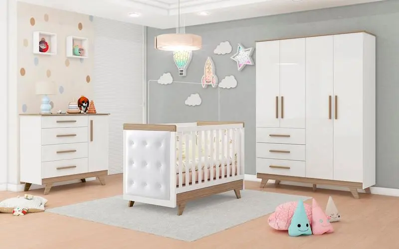Quarto Completo Bebê Retro Moveis Peroba 100% MDF Ls capitonê Branco Carvalho