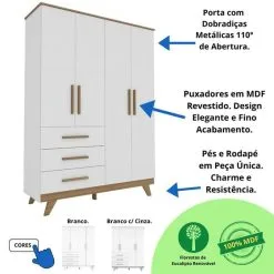 Tem 4 gavetas profundas que deslizam suavemente com Corrediças Telescópicas, durabilidade e segurança ao abrir e fechar. Possui o tampo com Bordas Laqueadas proporcionando um acabamento lindo e um cuidado extra para você e seu bebê. Conta ainda com 1 porta Lisa, cabideiro metálico e 1 prateleira.O Guarda Roupa Retrô 04 portas lisa é um produto 100% MDF, sua pintura é atoxica, possui cabideiros metálicos, puxadores em MDF revestido, divisórias de gavetas (vendidas separadamente) e corrediças telescópicas.