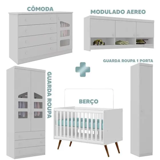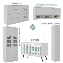 Itens Inclusos:1 berço, 1 cômoda, 1 guarda roupa 2 portas, 1 guarda roupa 1 porta, 1 armário aéreo