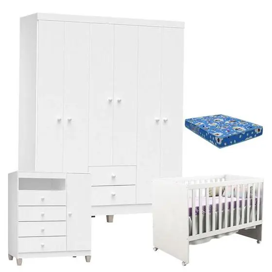 Quarto de Bebê 6 Portas Ternura Baby com Berço Gabi Branco Brilho com Colchão – Incorplac