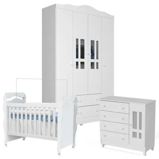 Quarto de Bebê Ariel 4 Portas com Berço New Nanda Branco Brilho – Carolina