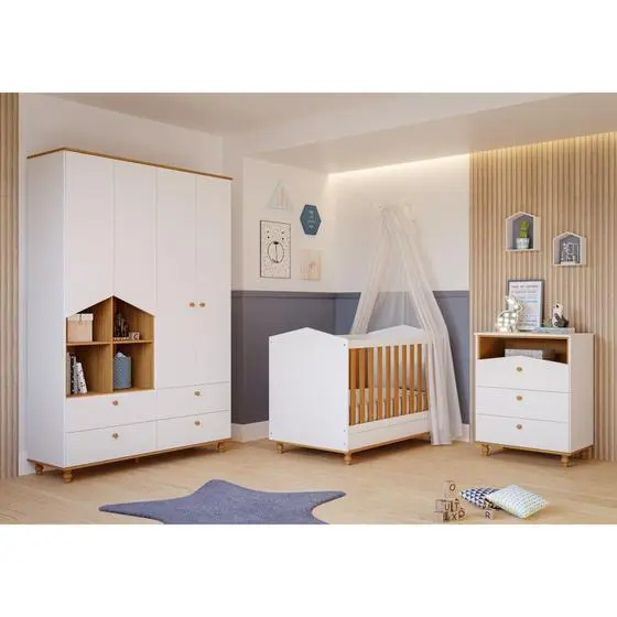 Jogo Quarto Para Bebê Helena Com Guarda Roupa 4 Portas + Cômoda + Berço Mini Cama 1344 Phoenix Baby