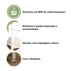 Se você procura por qualidade segurança e aquele toque clássico para montar o quarto do seu bebê, essa proposta vai te encantar. Os produtos são desenvolvidos em 100% MDF e acabamento em pintura UV atóxica, garantindo maior segurança para toda família. O berço possui a opção de montagem como Mini Cama promovendo o melhor aproveitamento do móvel e acompanhando o crescimento do bebê. Ele também conta com bordas arredondadas, 4 rodízios, sendo 2 com travas e registro no Inmetro. As gavetas possuem corrediças metálicas, facilitando o deslize. Acompanha 2 rodapés, um torneado e um reto, que você escolhe qual usar no momento da montagem. Um detalhe que oferece muito charme.