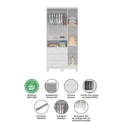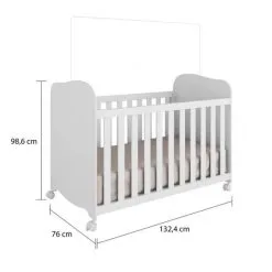 O Quarto Infantil Uli é desenvolvido em 100% MDF e pintura UV atóxica. São produtos que oferencem maior segurança para toda a família. O guarda roupa possui portas com janelas em PETG cristal, corrediças e cabideiro metálico. Também acompanha 2 modelos de rodapés (1 reto e 1 torneado – usinado), para que você escolha qual utilizar no momento da montagem. E o berço também conta com muitos benefícios e qualidades. Ele possui estrado móvel com 3 regulagens de altura, 4 rodízios sendo 2 com travas, grades fixa e claro, registro no INMETRO (001950/2019). O colchão indicado é de 70 x 130 (LxC). Tudo para que você e sua família tenham conforto e tranquilidade com a maior segurança.Medida dos produtos (cm):Berço: 98,60 x 132,40 x 76 (AxLxP)Guarda Roupa: 188,50 x 91,90 x 41,50 (AxLxP)
