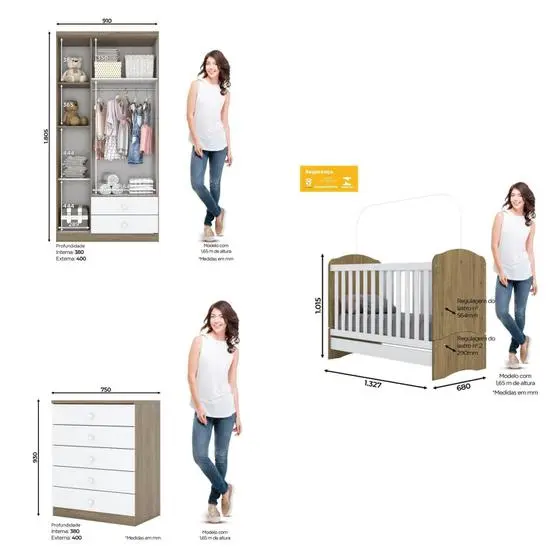 | Medida de Cada Item (A x L x P) (novo) | Guarda Roupa: 180,5cm x 91cm x 40cm Berço: 101,5cm x 132,7cm x 68cm Berço com o suporte para mosquiteiro: 148,7cm x 132,7cm x 68cm Cômoda: 93cm x 75cm x 40cm |