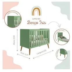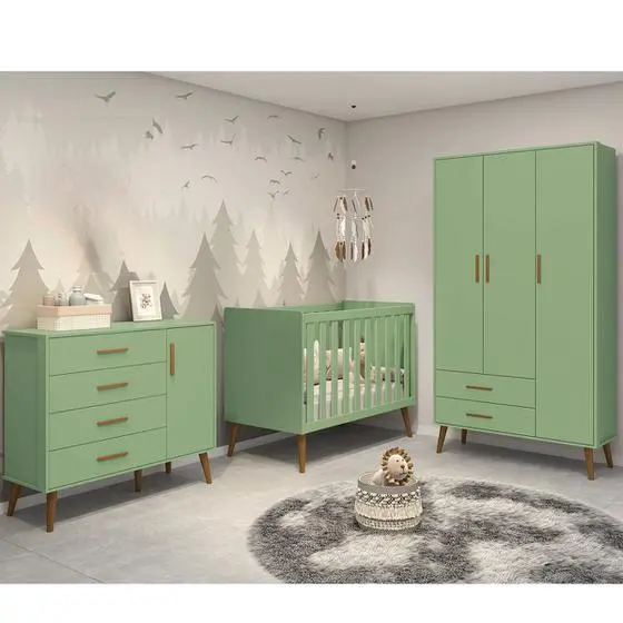 Quarto de Bebê com Guarda Roupa 3 Portas, Cômoda e Berço Retro Verde