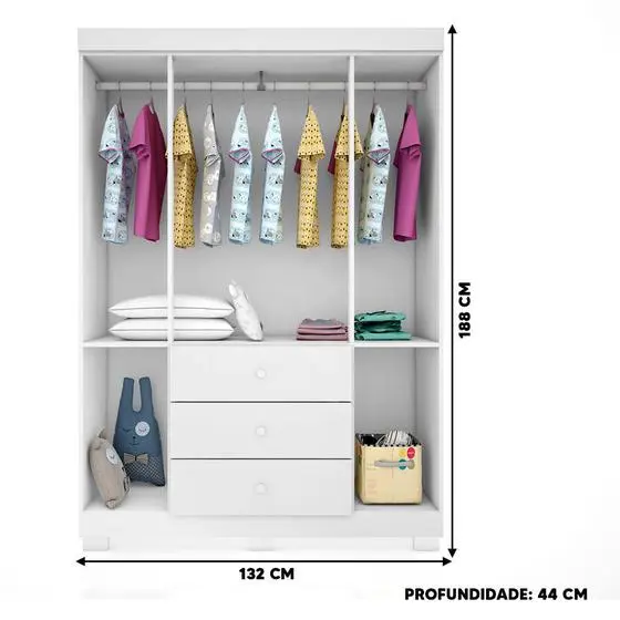 Dimensões do guarda roupa:Largura 132 cm; Profundidade 44 cm; Altura 188 cm;