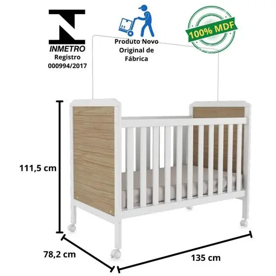 Dimensões do berço montado: Altura 111,5 cm x Largura 135 cm x Profundidade: 78,2 cm