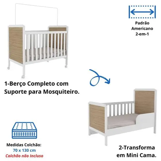 O berço Cloe é um produto versátil, 2 em 1, que vira Minicama. Berço está disponível nas cores: Branco Brilho / Branco Brilho com Carvalho.