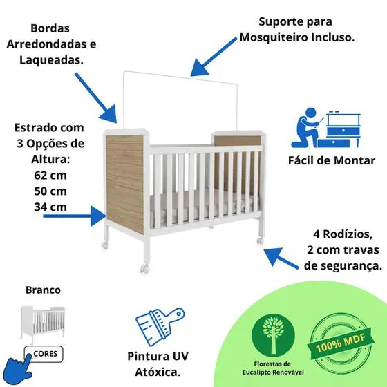 Possui a base do colchão com 03 opções de altura, acompanhando o crescimento do seu bebê. Conta ainda com 4 rodízios sendo 2 com trava de segurança. As grades são fabricadas em 25 e 12 mm, os quadros das cabeceiras também em chapa de 25 mm. Possui Bordas arredondadas e laqueadas, proporcionando maior segurança e uma sensação agradável ao toque.