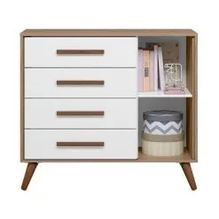 Estrutura em MDP de 12 mm e 15 mm;- 4 gavetas com corrediças metálicas;- 1 Porta com dobradiças metálicas; – Puxadores em MDF; – Cada gaveta suporta até 5kg;- Acompanha manual e todos os acessórios para montagem. Dimensões da Cômoda:- Especificações do Berço: – Estrutura cabeceira em MDP de 15 mm- Estrado em MDF de 6 mm;- Travessas do estrado em MDF de 25 mm;- Suporte Mosquiteiro em ferro com pintura epóxi;- Padrão americano;- Grades fixas;- 2 Rodízios com trava e 2 rodízios sem trava;- Estrado regulável com três alturas;- Berço vira mini cama;- Acabamento em pintura ultravioleta (UV) tinta atóxica;- Suporta até 40 kg distribuídos sem impacto;- Para segurança e proteção, os berços saem de fábrica com todas as funções para a montagem já feitas, – Acompanha manual e todos os acessórios para montagem.